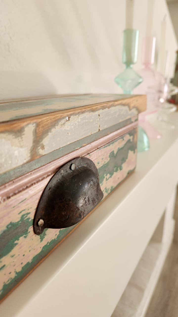 Cajas fabricadas artesanalmente con maderas recicladas en diferentes tonalidades con sus colores originales pintadas al aceite, formando un patchwork lineal.