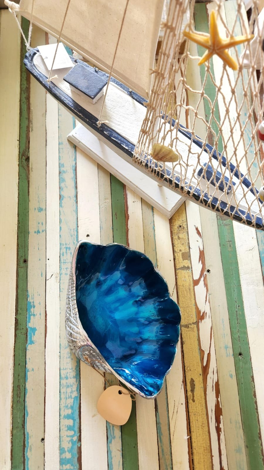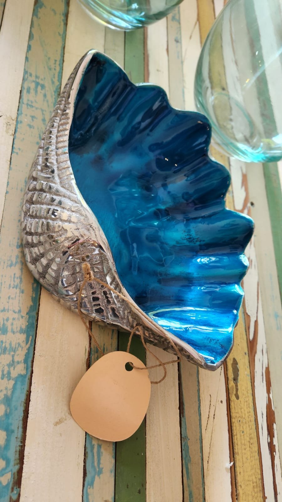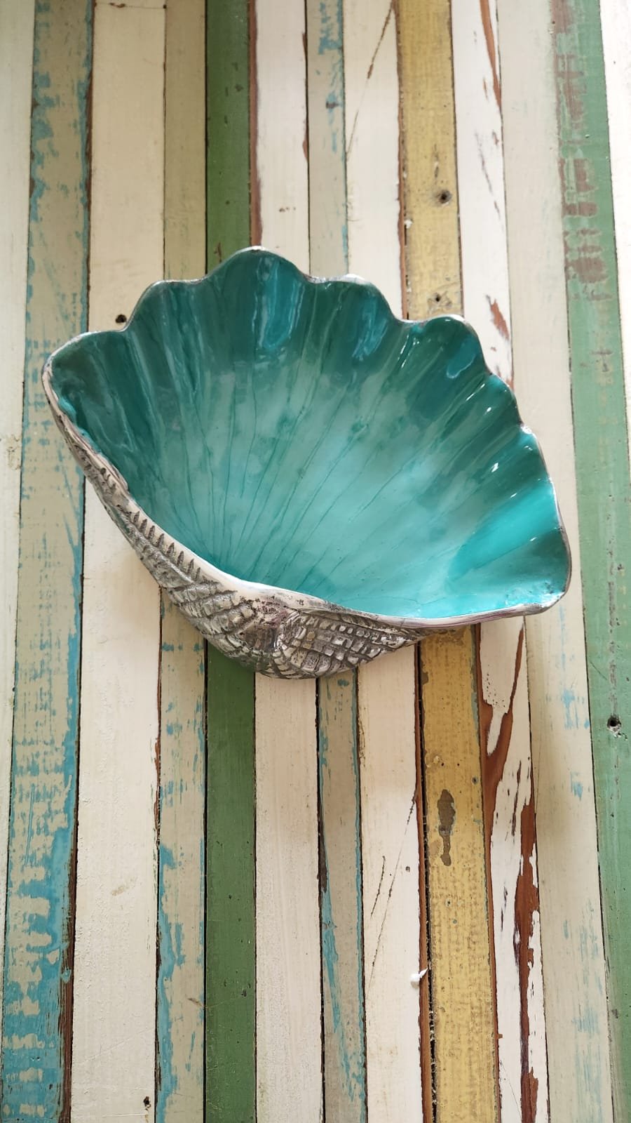 Cuencos en forma de ostra, realizados en aluminio con interior esmaltado, combinan brillo, textura y color para aportar un toque fresco y original a cualquier espacio.