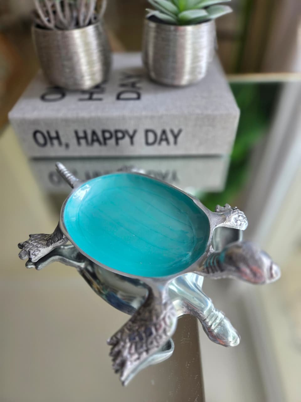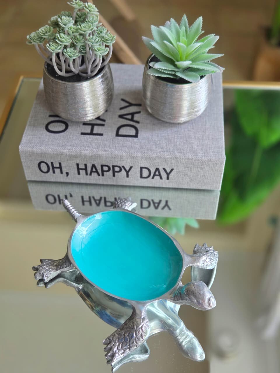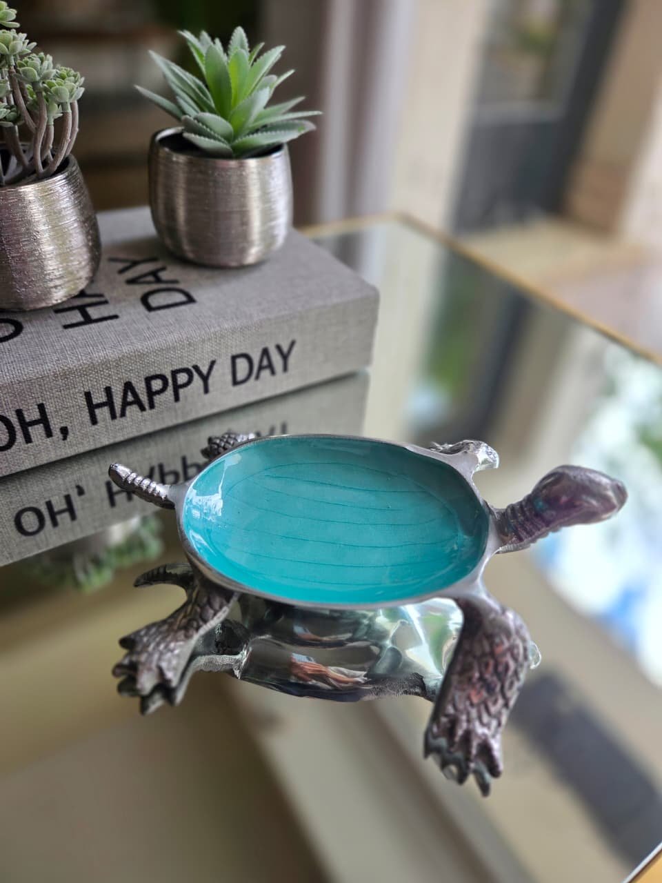 Cuencos en forma de tortuga, realizados en aluminio con interior esmaltado, combinan brillo, textura y color para aportar un toque fresco y original a cualquier espacio.