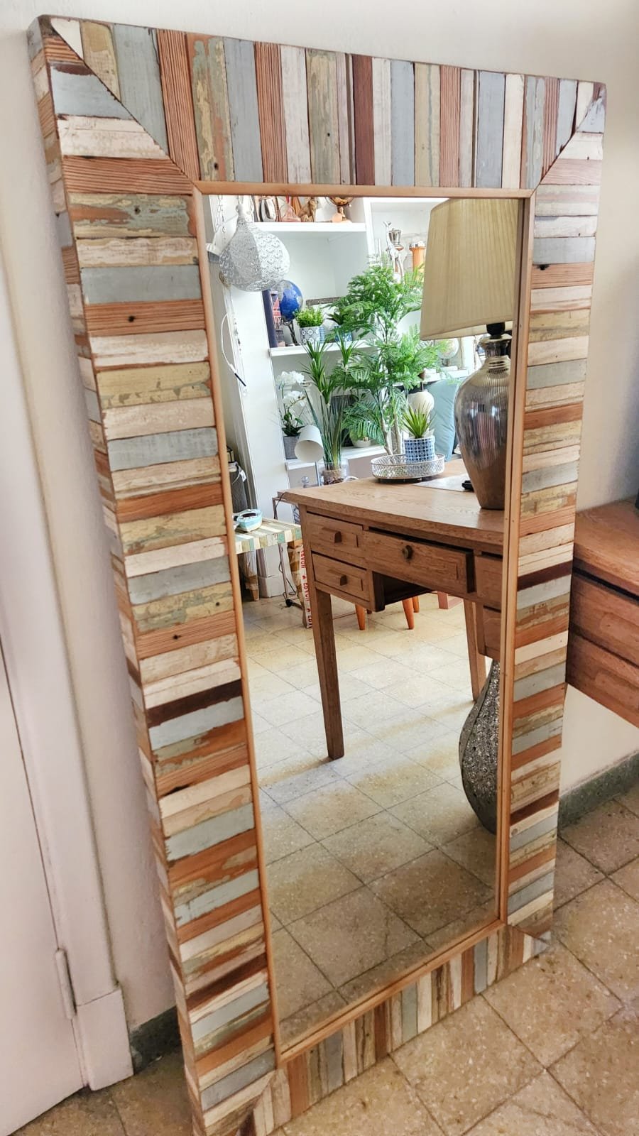 Espejo con borde en relieve ancho fabricado artesanalmente con maderas recicladas en diferentes tonalidades con sus colores originales pintadas al aceite, formando un patchwork lineal.