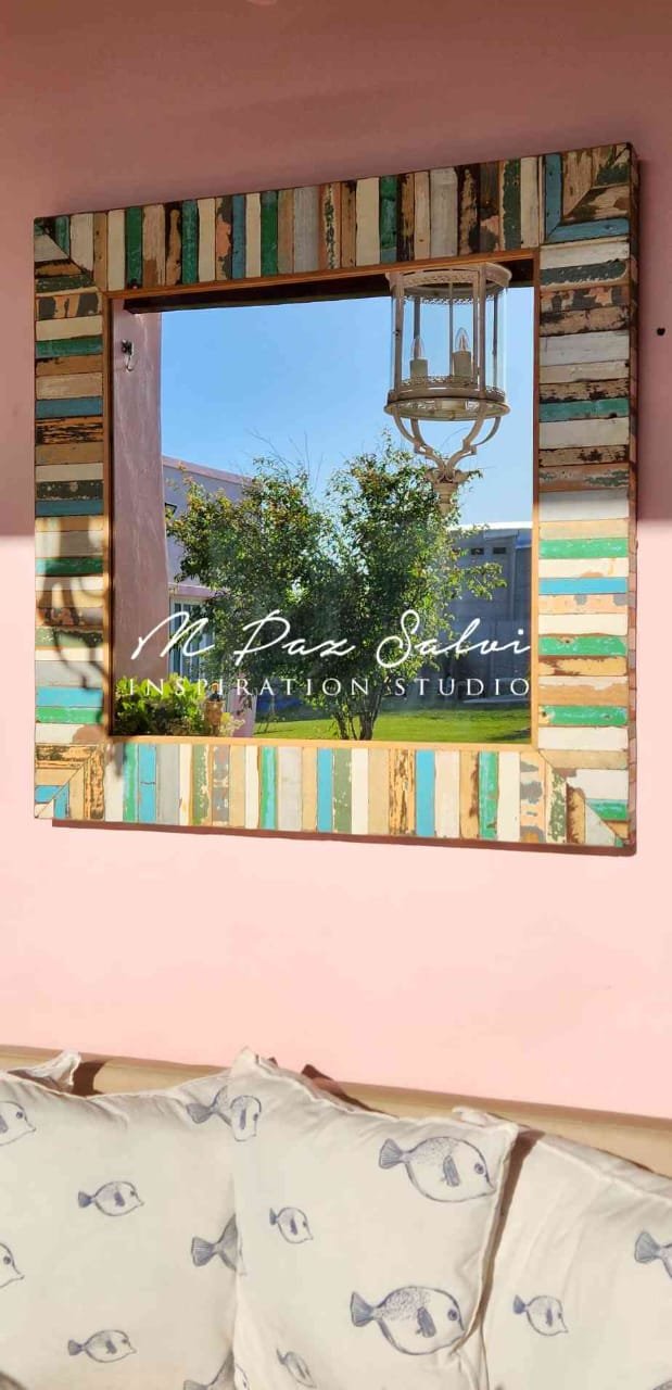 Espejo con borde en relieve ancho fabricado artesanalmente con maderas recicladas en diferentes tonalidades con sus colores originales pintadas al aceite, formando un patchwork lineal.
