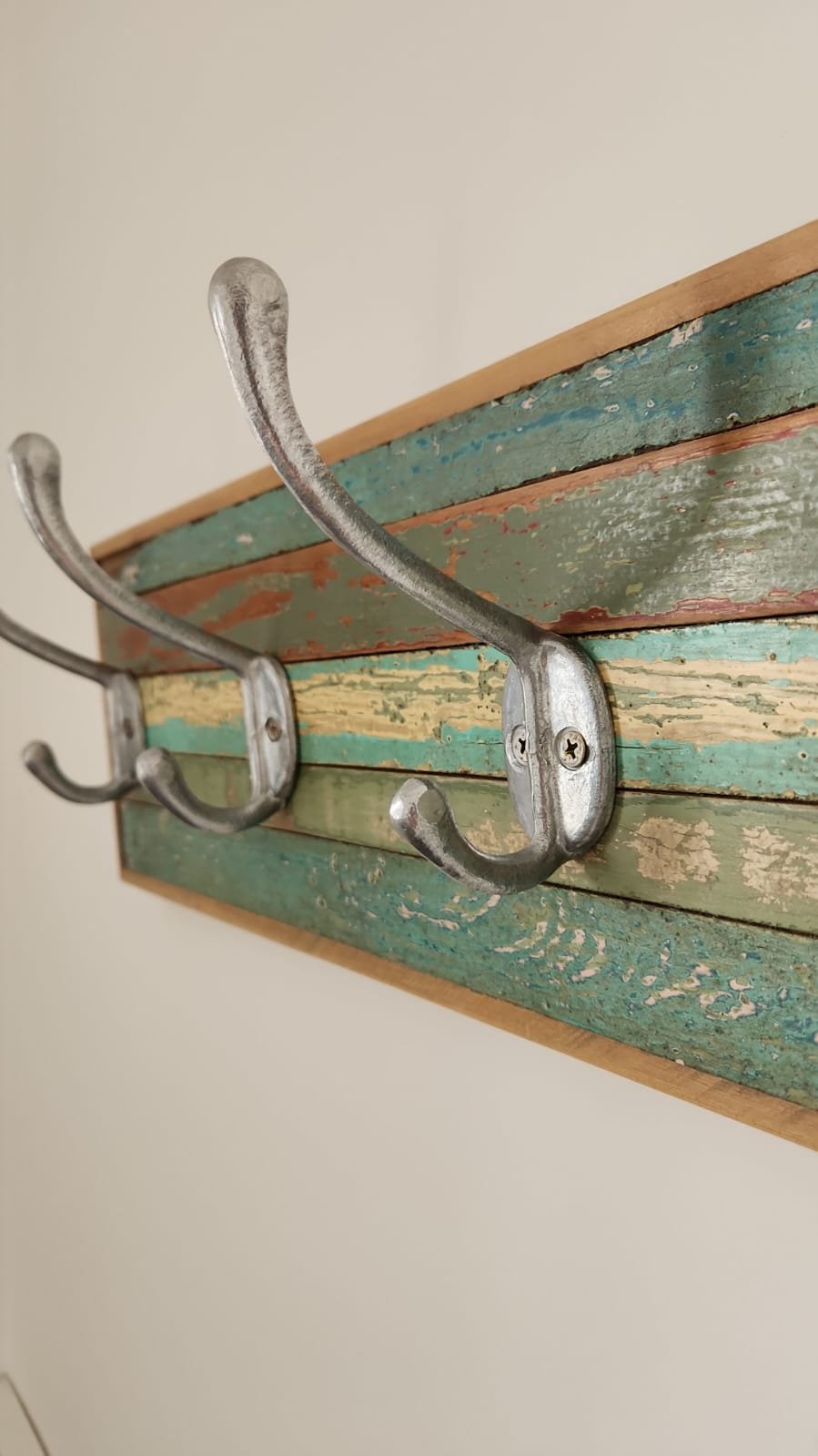 Percheros fabricados artesanalmente con maderas recicladas en diferentes tonalidades con sus colores originales pintadas al aceite, formando un patchwork lineal.