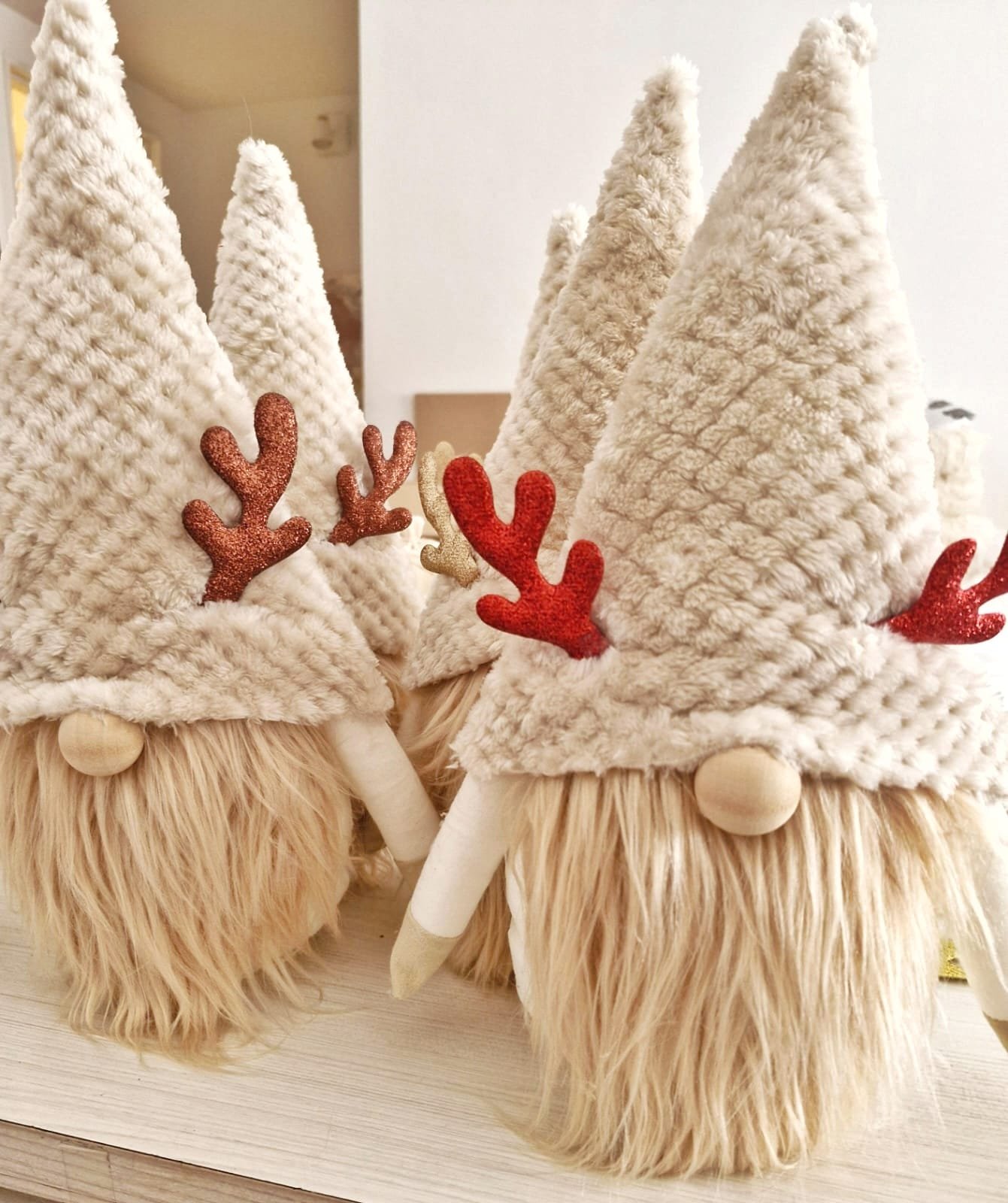 Reno decorativo navideño elaborado en tonos neutros, con textura suave y detalles en glitter que aportan un toque festivo.